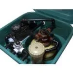 Casilla de polietileno rotomoldeado con orificio inferior para evitar inundaciones. Ideada para ser enterrada y dejar visible sólo tapa, en su interior encontramos los alojamientos para la fijación del filtro VC-50 y la electrobomba. Este centro compacto de instalación se convierte en una excelente opción para la disminución de tiempos y procesos, simplificando y haciendo más económico el proyecto.